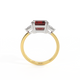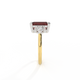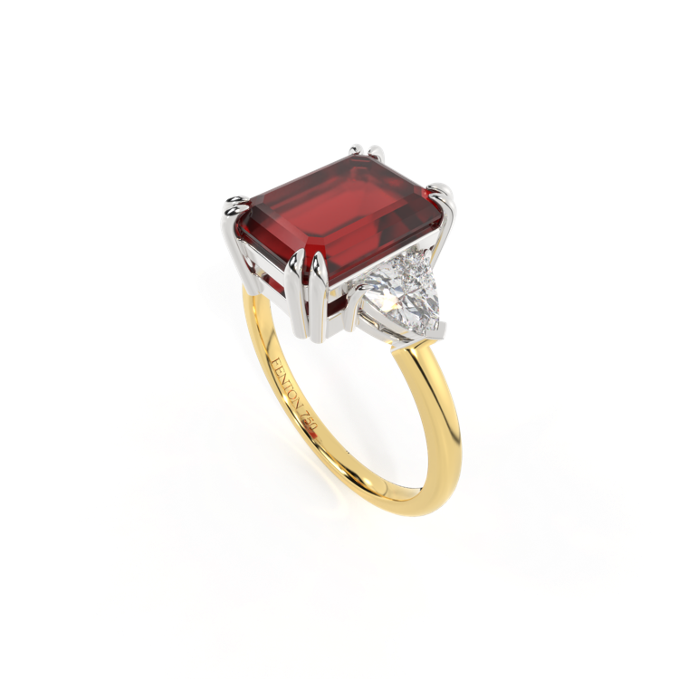 All of our rings are available in blue sapphire, ruby, emerald, pink sapphire, yellow sapphire, garnet and aquamarine. We offer three metals, 18K rose gold, 18K yellow gold and platinum. The centre stones are available in four cuts, round, cushion, oval and emerald cut and five sizes for each cut and style.