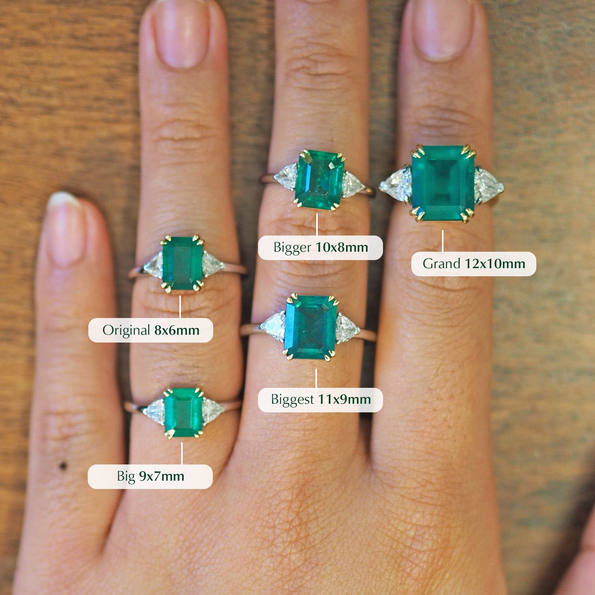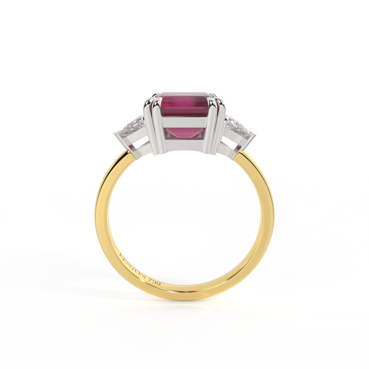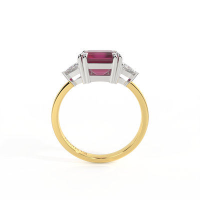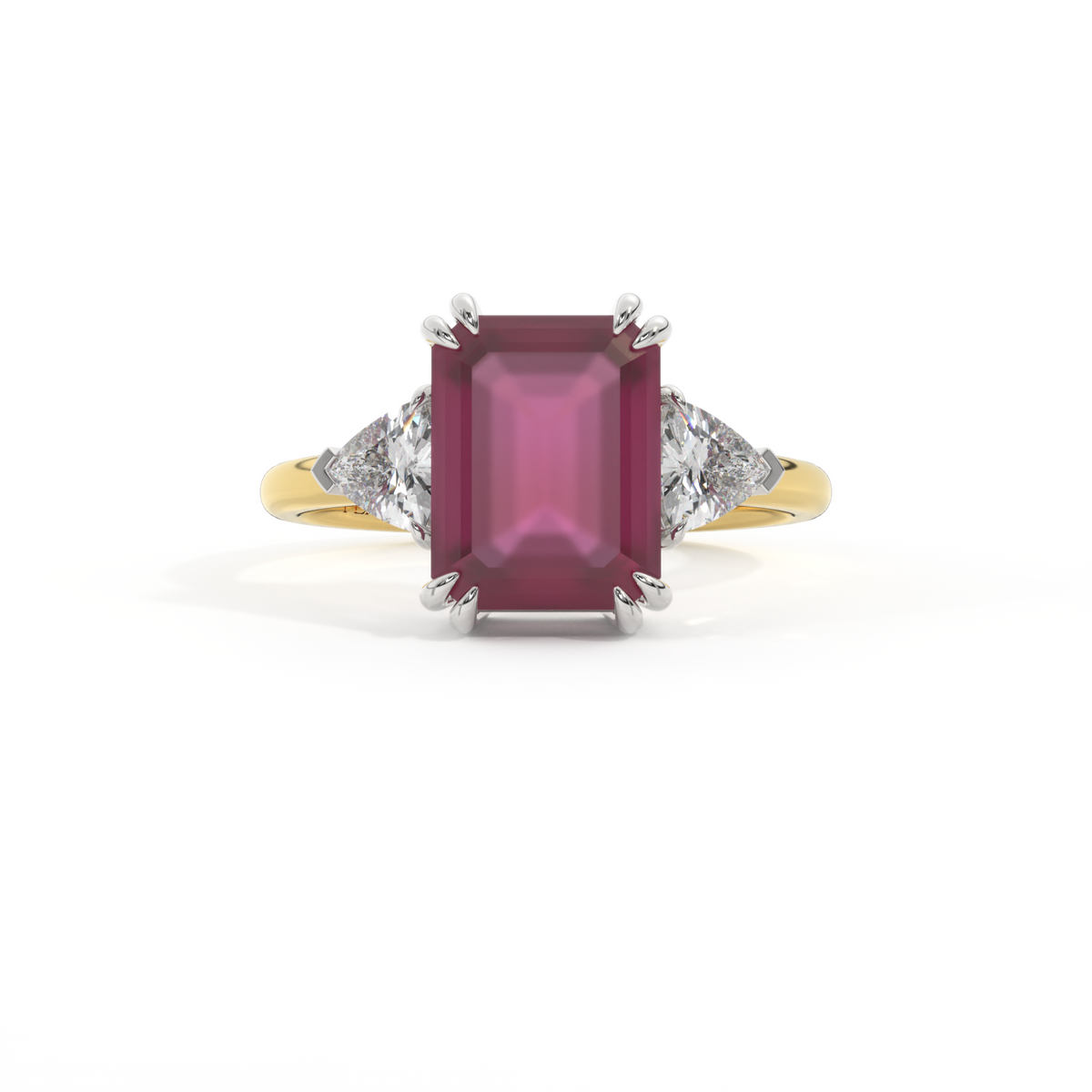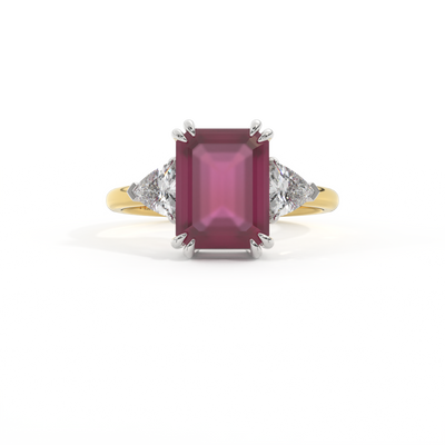 All of our rings are available in blue sapphire, ruby, emerald, pink sapphire, yellow sapphire, garnet and aquamarine. We offer three metals, 18K rose gold, 18K yellow gold and platinum. The centre stones are available in four cuts, round, cushion, oval and emerald cut and five sizes for each cut and style.