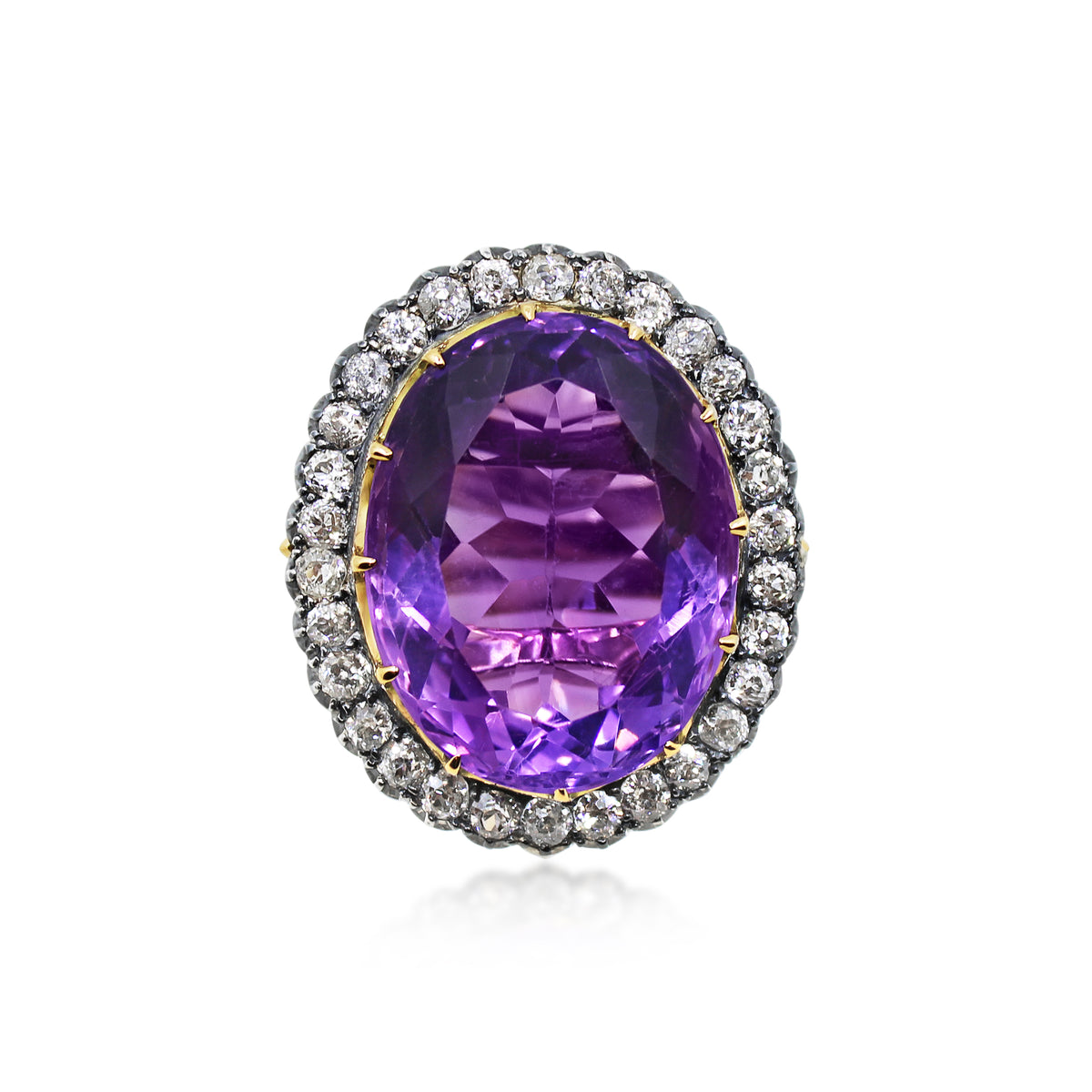 Victorian amethyst and diamond cocktail cluster ring, the large oval amethyst weighing approx. 35.00cts within an old mine-cut diamond surround, the 19th century cluster later mounted as a ring, mounted in silver and 18ct rose gold, size K